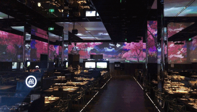 继续往前走就是就餐区了。360°全屋环绕式立体投影,5块超大穹顶屏幕,6大场景主题(星空、桃园仙境、雪山、油画、治愈系)……为顾客呈上一场视觉、味觉、嗅觉、听觉的全感式火锅盛宴,整个场景的创意团队包括央视导演等专业人士。